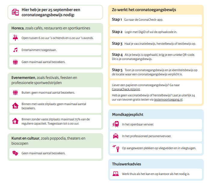 Vanaf 25 september is er in alle horeca (behalve afhaalrestaurants), bij evenementen (zoals festivals, optredens, feesten en publiek bij professionele sportwedstrijden) en bij vertoning van kunst en cultuur (zoals in bioscopen en theaters) gewerkt alleen toegang mogelijk met het coronatoegangsbewijs voor iedereen vanaf 13 jaar. Dat geldt binnen én buiten, met én zonder vaste zitplaats. Vanaf 14 jaar moet het gebruik van het coronatoegangsbewijs samen met het identiteitsbewijs worden gecontroleerd. In alle horeca blijft de verplichte sluitingstijd tussen 00.00 en 06.00 uur gelden. Alle evenementen kunnen weer plaatsvinden met een coronatoegangsbewijs. Voor evenementen buiten geldt geen maximaal aantal bezoekers en geen verplichte sluitingstijd. Voor evenementen binnen met een vaste zitplaats is er ook geen maximaal aantal bezoekers of sluitingstijd. Voor beide type evenementen geldt wel: horeca is na 0.00 uur gesloten, met uitzondering van afhaalmogelijkheden. Evenementen binnen zonder vaste zitplaats kunnen maximaal 75% van de reguliere bezoekerscapaciteit toestaan en er geldt hier een verplichte sluitingstijd tussen 00.00 en 06.00 uur. Het kabinet werkt voor de nachthoreca en de ongeplaceerde evenementen met een capaciteitsbeperking aan steunmaatregelen.