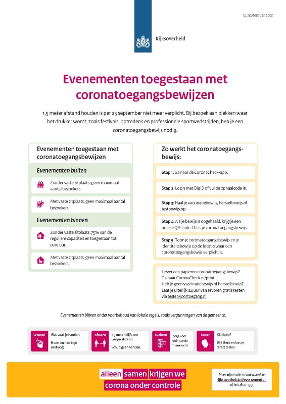 EVENEMENTEN CORONA - Evenementen en festivals, ook meerdaagse, mogen weer volop georganiseerd worden zonder 1,5 meter afstand en zonder vaste zitplaatsen. Terwijl nu dus alle maatregelen zijn losgelaten, is het corona-toegangsbewijs een nieuwe voorwaarde om zonder deze maatregelen evenementen te organiseren.