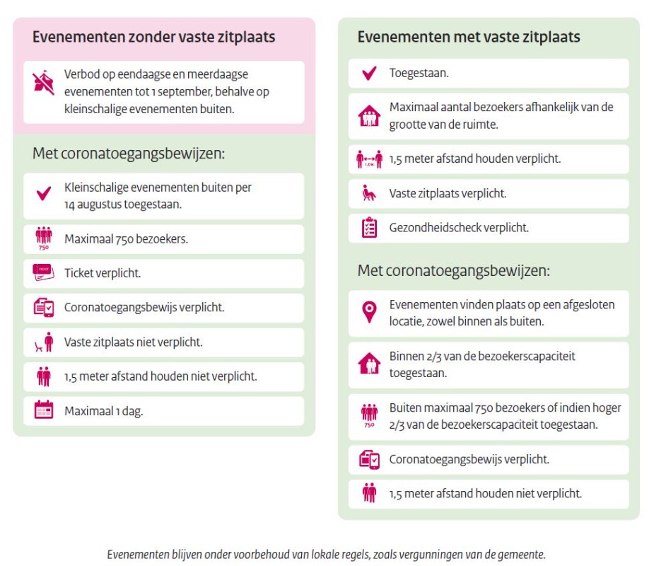Kleinschalige evenementen worden vanaf 14 augustus onder voorwaarden weer toegestaan. Evenementen buiten (of in een open tent), zonder vaste zitplaats kunnen met maximaal 750 bezoekers georganiseerd worden. Bezoekers moeten een coronatoegangsbewijs hebben. Dat betekent een vaccinatiebewijs, herstelbewijs van maximaal 6 maanden oud, of een negatieve testuitslag van minder dan 24 uur voor het evenement. De 1,5 meter afstand kan dan worden losgelaten tijdens het evenement. Het gaat bijvoorbeeld om festivals, culturele activiteiten en activiteiten van studentenverenigingen met minder dan 750 bezoekers.