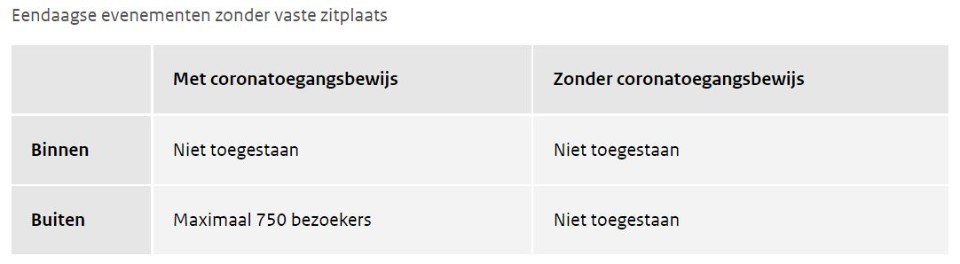 - Voor (zakelijke) evenementen in doorstroomlocaties, waarbij publiek kort in dezelfde ruimte is en er geen vaste zitplaatsen zijn, geldt een uitzondering op bovenstaande regels voor evenementen.