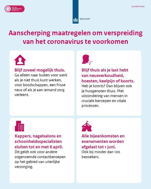EVENEMENTEN CORONA - De maatregelen tijdens de Corona-crisis zijn aangescherpt. Voor evenementen, bijeenkomsten en samenkomsten (meer dan 3 personen) zijn volledig verboden tot 1 juni 2020.