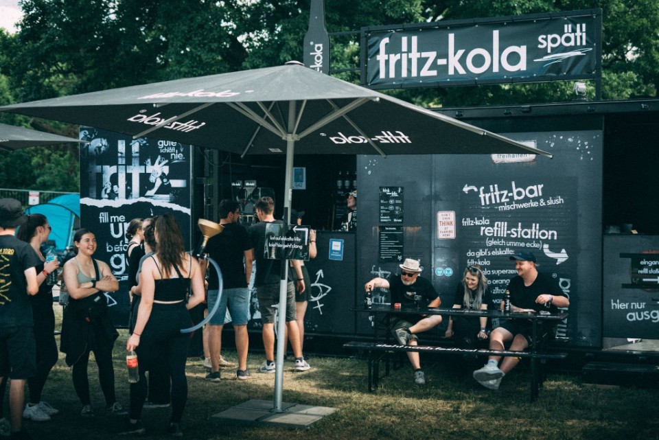 Omdat glazen flessen verboden zijn op de meeste festivals, maken we gebruik van onze pre-mix tapmachines (momenteel alleen beschikbaar in Duitsland voor festivals) om ijskoude fritz-kola aan te bieden op de campings. Festivalgangers worden aangemoedigd om hun herbruikbare flessen mee te nemen of een "SIGG"-fles te kopen. Deze initiatieven zorgen niet alleen voor een verfrissende ervaring, maar pleiten ook voor milieuvriendelijke alternatieven en verminderen het gebruik van duizenden plastic flessen.